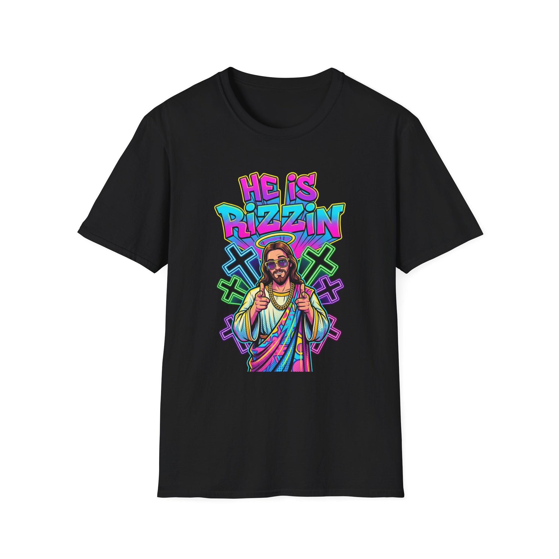He Is Rizzin! The ultimate Easter meme tee with Jesus bringing the rizz. Bold neon pop art style on a soft black Gildan Softstyle tee. Perfect for Easter brunch.